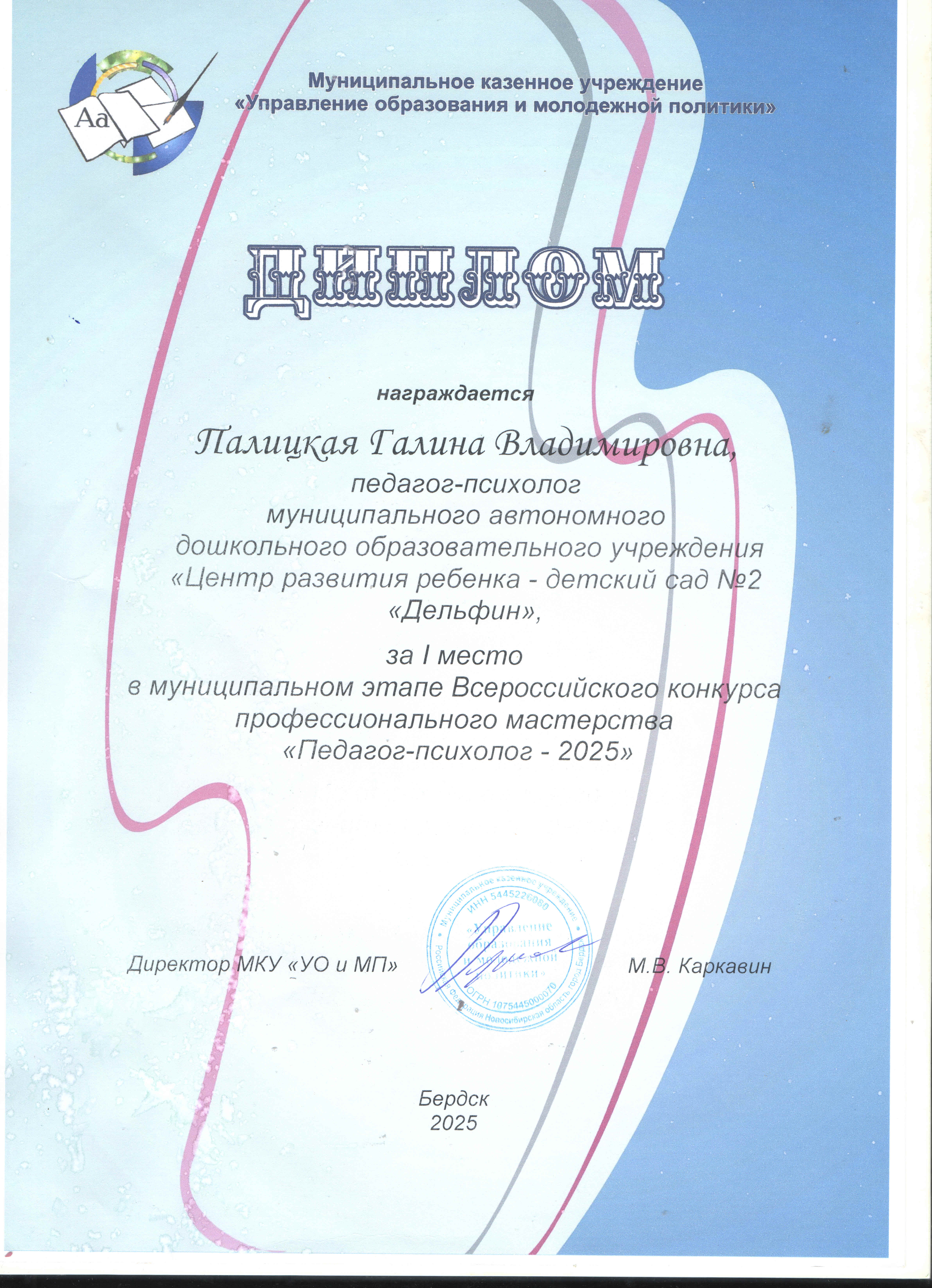 Диплом за 1 место в муниципальном этапе Всероссийского конкурса профессионального мастерства "Педагог-психолог 2025"